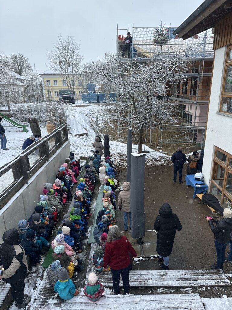Am Freitag, den 21. November, fand in unserer Kindertagesstätte das Richtfest für den Erweiterungsbau statt. Zu diesem besonderen Anlass waren der Elternbeirat, Mitglieder des Gemeinderates, Architekt, Vertreter der beteiligten Baufirmen sowie das gesamte Kita-Personal eingeladen.